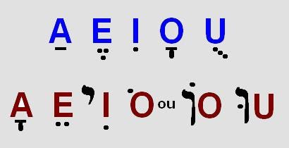 - Cada consonante pode ser lida com os sons "a", "ê", "é", "i", "o", "u" ou pode ser "muda". Por exemplo, a letra